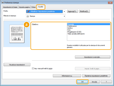 Selezionare un'opzione in base al tipo di documento o allo scopo di stampa. Ad esempio, selezionare [Generale] per uso generico, oppure [Foto] quando occorre stampare fotografie con una qualità di stampa ottimale.