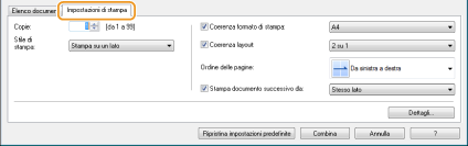 Fare clic sulla scheda [Impostazioni di stampa] per visualizzare la schermata in cui specificare le impostazioni di stampa, come il numero di copie. Le impostazioni specificate qui vengono applicate all'intero lavoro di stampa.