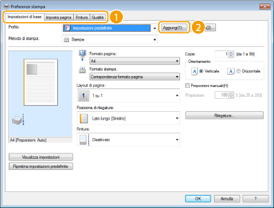 Configurare le impostazioni di stampa secondo le proprie esigenze nelle schede [Impostazioni di base], [Imposta pagina], [Finitura] e [Qualità].