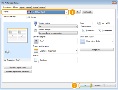 Indicare le combinazioni di impostazioni come "orientamento orizzontale su carta in formato A4 in modalità risparmio toner" ogni volta che si stampa può costituire una perdita di tempo. Se si registrano le combinazioni di impostazioni di stampa utilizzate più spesso come "profili", è possibile specificare le impostazioni semplicemente selezionando uno di questi profili dall'elenco. In questa sezione viene descritto come registrare i profili e come utilizzarli.