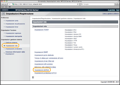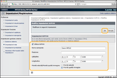 È possibile registrare le informazioni, compresi il nome della macchina e la posizione di installazione, utilizzate per identificarla. È inoltre possibile disabilitare la funzione AirPrint della macchina. Utilizzare la IU remota per modificare tali impostazioni.