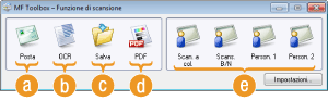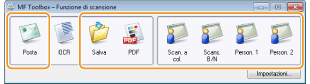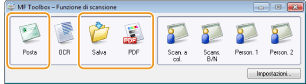 È possibile salvare i documenti acquisiti su computer, inoltrarli ad un'applicazione specifica per modificarli o allegarli ad un messaggio e-mail. MF Toolbox offre impostazioni predefinite per ciascuno scopo, inclusa la conversione in PDF e la scansione a colori. È possibile eseguire la scansione in modo semplice selezionando un'impostazione predefinita.