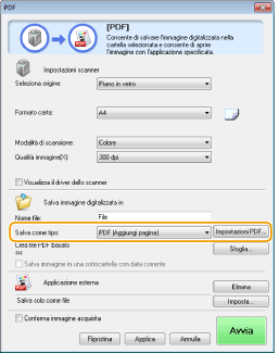 ), [Salva immagine digitalizzata in] passa a [Crea file PDF basato su]. In questo caso, fare clic su [Sfoglia] e specificare un file PDF esistente al quale si desidera aggiungere i nuovi dati del documento acquisiti. I dati sono aggiunti al file esistente come pagine addizionali.