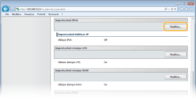 Gli indirizzi IPv6 della macchina possono essere configurati attraverso la IU remota. Prima di impostare indirizzi IPv6, verificare le impostazioni dell'indirizzo IPv4 (Visualizzazione delle impostazioni IPv4). È necessario impostare correttamente i parametri IPv4 per utilizzare gli indirizzi IPv6. Tenere presente che la funzione di scansione che utilizza il driver dello scanner o MF Toolbox non è disponibile in ambiente IPv6. La macchina può utilizzare fino a nove dei seguenti indirizzi IPv6: