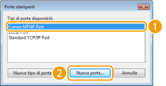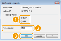 Aggiungere una nuova porta se l'indirizzo IP sulla macchina è stato cambiato. L'aggiunta di una porta è anche una soluzione efficace quando un tipo di porta non corretto è stato selezionato dalla cartella stampanti di Windows durante l'installazione dei driver di stampa.