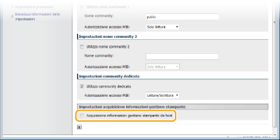Selezionare la casella di controllo [Utilizzo community dedicata] e specificare l'impostazione [Autorizzazione accesso MIB].
