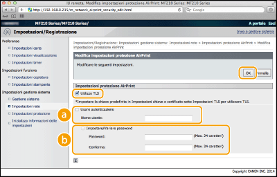 Quando si utilizza AirPrint, è possibile impiegare l'autenticazione. Per utilizzare l'autenticazione, selezionare la casella di controllo e specificare un [Nome utente].