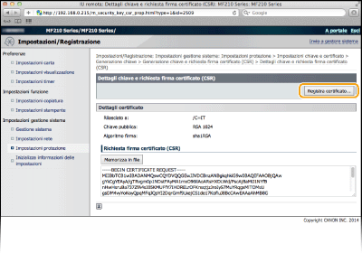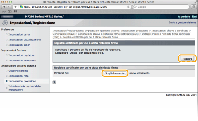 Fare clic su [Scegli documento], specificare il file per la richiesta CSR e fare clic su [Registra].