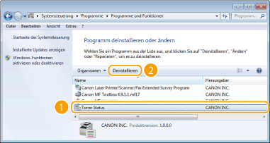 Wählen Sie [Toner Status] aus, und klicken Sie auf [Deinstallieren] oder [Entfernen].