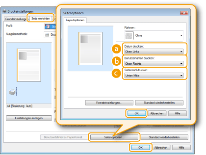 Wählen Sie die Druckposition von Druckdatum, Anwendername oder Seitenzahl
