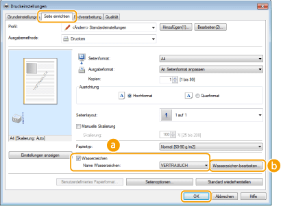 Aktivieren Sie das Kontrollkästchen [Wasserzeichen], um die Liste der Wasserzeichen in der Dropdown-Liste [Name Wasserzeichen] anzuzeigen. Wählen Sie ein Wasserzeichen aus dem Menü aus.