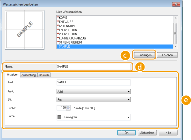 Zeigt den Bildschirm an, mit dem Sie Wasserzeichen erstellen oder bearbeiten können.