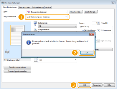 Wählen Sie in [Ausgabemethode] die Option [Bearbeitung und Vorschau].