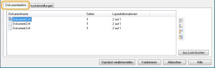 Klicken Sie auf die Registerkarte [Dokumentenliste], um die in Schritt 1 bis 4 hinzugefügten Dokumente anzuzeigen. Sie können Dokumente aus der Liste entfernen, indem Sie sie auswählen und auf [Aus Liste löschen] klicken.