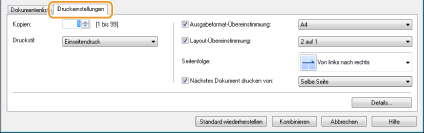 Klicken Sie auf die Registerkarte [Druckeinstellungen], um den Bildschirm zum Vornehmen von Druckeinstellungen wie Anzahl der Kopien aufzurufen. Die hier vorgenommenen Einstellungen gelten für den ganzen Druckauftrag.