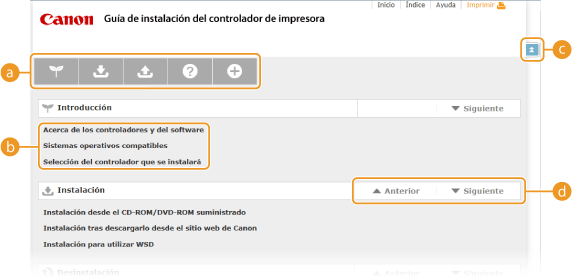 La Guía de instalación se divide en varias pantallas y cada una tiene contenidos diferentes.
