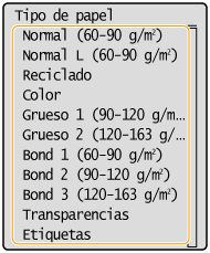 Podrá configurar el equipo para que muestre únicamente los tamaños de papel utilizados frecuentemente en la pantalla de selección.