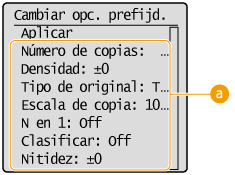 . Si cambia esta configuración predeterminada para adaptarla a las operaciones que realiza con mayor frecuencia, puede eliminar la necesidad de realizar la misma configuración cada vez que realice copias.