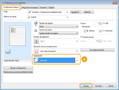 Seleccione [Intercalar] o [Agrupar] en [Acabado]