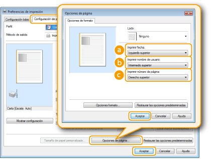 Pestaña [Configuración de página] Haga clic en [Opciones de página] Seleccione la posición de impresión de la fecha de impresión, el nombre de usuario o el número de página [Aceptar]  [Aceptar]