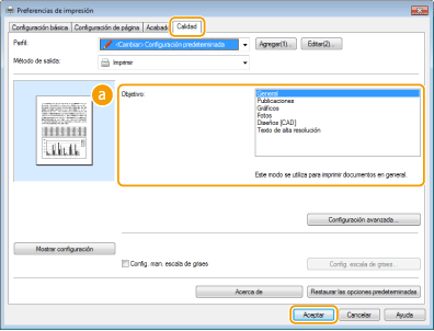 Seleccione una opción que se adapte al tipo de documento o al propósito de la impresión. Por ejemplo, seleccione [General] para el uso general, o seleccione [Fotos] cuando desee imprimir imágenes fotográficas con una calidad de impresión óptima.