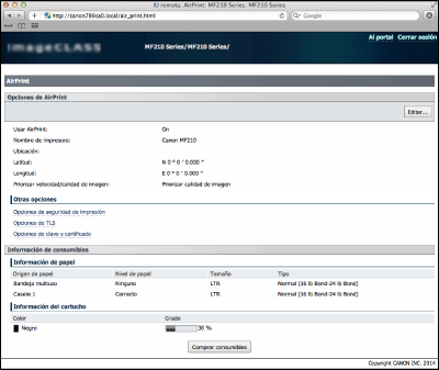 Puede visualizar la pantalla de AirPrint, en la que no solo puede acceder a las opciones de AirPrint, sino que también puede visualizar información sobre los consumibles, como el papel y el tóner.
