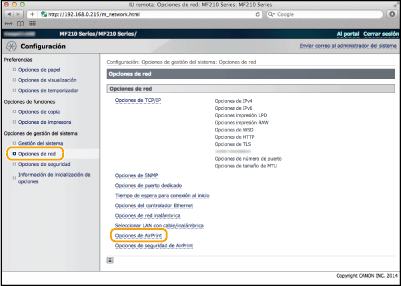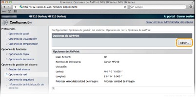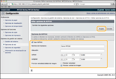 Puede registrar la información, incluido el nombre del equipo y la ubicación de instalación, que se utilice para identificar el equipo. Asimismo, puede deshabilitar la función AirPrint del equipo. Utilice la IU remota para cambiar estas opciones.