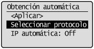 ![]() Si aparece <On>, seleccione <Obtención automática> y establezca tanto <Seleccionar protocolo> como <IP automática> en <Off>.