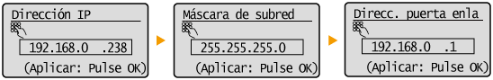<Máscara de subred> <Direcc. puerta enlace>.Introduzca cada opción utilizando las teclas numéricas, y pulse