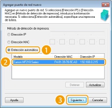 Haga clic en [Detección automática], seleccione el equipo cuando se detecte y haga clic en [Siguiente].