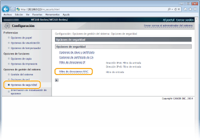 Podrá activar o desactivar las opciones de filtrado de direcciones IP en <Menú>. Filtro de direcciones MAC