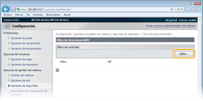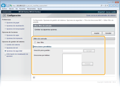![]() Comprobación de los errores de entrada Si las direcciones MAC se introducen de forma incorrecta, es posible que no pueda acceder al equipo desde la IU remota, en cuyo caso deberá establecer <Filtro direcciones MAC> en <Off>. Filtro de direcciones MAC