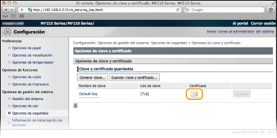 Haga clic en [Opciones de seguridad]  [Opciones de clave y certificado] (para los pares de claves) u [Opciones de certificado de CA] (para los certificados de CA).