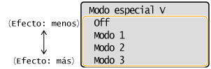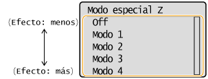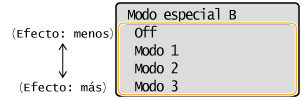 Al especificar <Off> o <Modo 1>, podrían aparecer rayas en el papel de impresión. Al especificar <Modo 3> o <Modo 4>, los contornos podría aparecer borrosos o las imágenes podrían aparecer en cierto modo granuladas. La densidad de impresión se hará más clara a medida que el valor progrese desde <Off> hasta <Modo 4>.