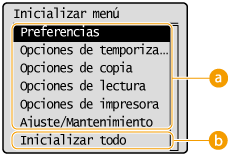 Para inicializar las opciones de <Opciones de red> y <Opciones de gestión del sistema>, consulte Inicialización de las opciones de gestión del sistema.