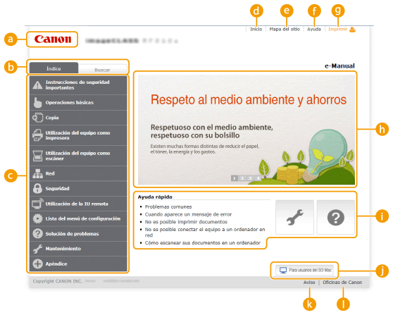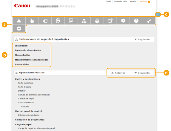 El e-Manual se divide en diferentes pantallas y el contenido de cada pantalla varía.