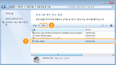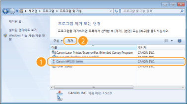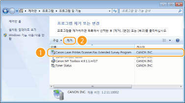 [Canon Laser Printer/Scanner/Fax Extended Survey Program]을 선택하고 [제거]를 선택합니다.