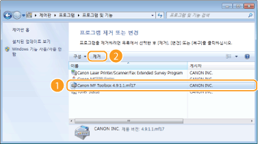 설치된 MF 드라이버, MF Toolbox 또는 Product Extended Survey Program이 더 이상 필요하지 않으면 제거하여 컴퓨터에서 삭제할 수 있습니다.