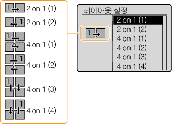 2매 또는 4매의 문서를 크기를 줄여 한 장의 용지에 복사할 수 있습니다. 그러면 페이지 수가 줄어들어 용지를 절약할 수 있습니다.