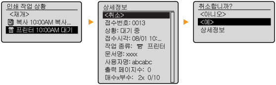 리모트 UI에서 취소 (MF212w)리모트 UI의 [작업상황] 페이지에서 인쇄를 취소할 수 있습니다: 인쇄 문서의 현재 상태 확인