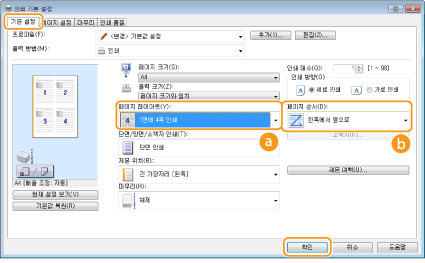 여러 페이지를 한 장에 인쇄할 수 있습니다. 예를 들어, [1면에 4쪽 인쇄] 또는 [1면에 9쪽 인쇄]를 사용하여 4페이지 또는 9페이지를 한 장에 인쇄할 수 있습니다. 용지를 절약하거나 문서를 축소판으로 보려면 이 기능을 사용합니다.