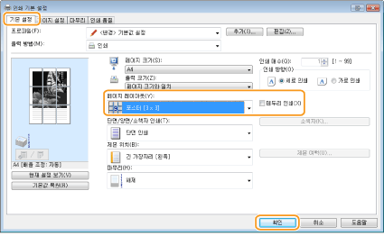 [기본 설정] 탭  [페이지 레이아웃]에서 포스터 크기 선택(예를 들어, [포스터 [2 x 2]]) [확인]
