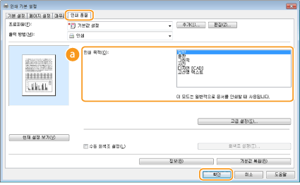 [인쇄 목적]에서 선택한 각 항목에 대해 세부 설정을 지정하려면 [고급 설정]을 클릭하십시오. 자세한 내용을 보려면 프린터 드라이버 화면에서 [도움말]을 클릭하십시오.