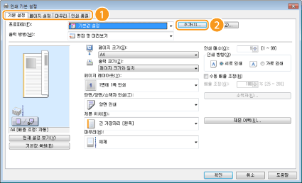 인쇄할 때마다 "토너 절약 모드에서 A4 크기 용지에 단면 가로 방향"과 같은 설정 조합을 지정하는 것은 시간이 많이 걸리는 작업입니다. 자주 사용하는 인쇄 설정 조합을 "프로파일"로 등록하면 간단히 목록에서 이러한 프로파일 중 하나를 선택하여 인쇄 설정을 지정할 수 있습니다. 이 단원에서는 프로파일을 등록하고 해당 프로파일을 사용하여 인쇄하는 방법을 설명합니다.