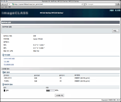 AirPrint용 화면을 표시하고 AirPrint 설정에 액세스할 수 있을 뿐만 아니라 용지 및 토너와 같은 소모품에 대한 정보를 볼 수도 있습니다.