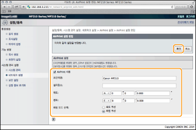 Apple 장치를 작동할 때 이 기기를 식별하는 데 도움이 되도록 이름 및 설치 위치 정보를 입력합니다. 이 정보는 AirPrint 프린터가 여러 대 있는 경우에 유용합니다.