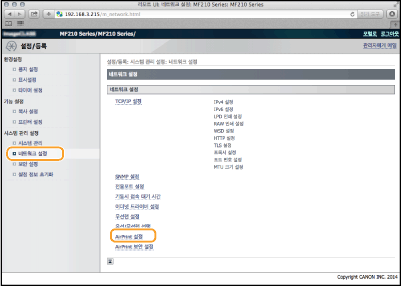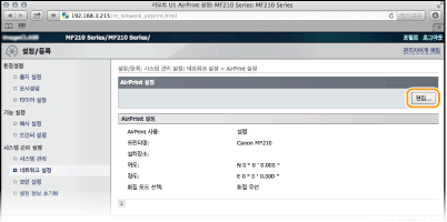 기기 이름 및 설치 위치를 포함하여 기기를 식별하는 데 사용되는 정보를 등록할 수 있습니다. 기기의 AirPrint 기능을 비활성화할 수도 있습니다. 이러한 설정을 변경하려면 리모트 UI를 사용합니다.
