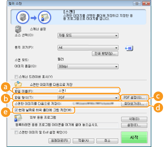)에서 [PDF], [PDF(한 페이지)], [PDF(여러 페이지)] 또는 [PDF(페이지 추가)]를 선택한 경우 PDF 파일에 대한 고급 설정을 구성할 수 있습니다.