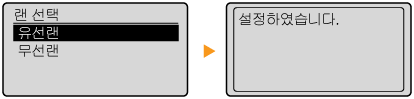 기기를 컴퓨터에 연결할 유선 또는 무선 LAN을 결정한 후에 조작 패널을 사용하여 유선 LAN 또는 무선 LAN을 선택합니다. 무선/유선 LAN을 연결하고 설정을 지정하는 방법은 "간단 설치 가이드"를 참조하십시오(