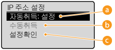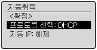 ![]() <설정>이 표시되면 <자동취득>을 선택하고 <프로토콜 선택> 및 <자동 IP>를 모두 <해제>로 설정합니다.